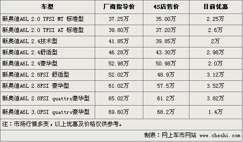 新款?yuàn)W迪A6L通過(guò)外觀和安全等方面的改款升級(jí),在同級(jí)別車型中擁有了更高的性價(jià)比,入門級(jí)車型價(jià)格更能夠比拼寶馬3系等對(duì)手。根據(jù)網(wǎng)上車市價(jià)格監(jiān)測(cè)系統(tǒng)顯示,目前奧迪A6L全系優(yōu)惠幅度有進(jìn)一步增加,2.0入門車優(yōu)惠后僅售35萬(wàn),具體車型以及價(jià)格如下: