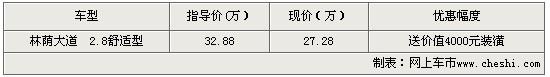 據林蔭大道銷售人員表示,購買林蔭大道 2.8舒適型除了可以得到最高5.6萬元的價格優惠外,商家還在每輛車銷售的同時還搭配汽車裝潢贈品。商家現在展廳有黑色和炭晶兩款現車。更多詳情隨時聯系經銷商。