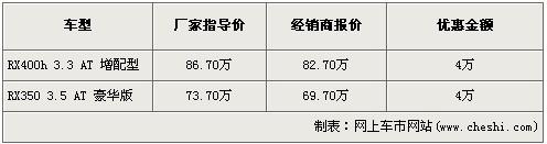 3月25日,雷克薩斯正式推出了全新的RX350車型,共計兩款車型,售價分別為79.2萬和 85.8萬元。目前,廣州地區(qū)舊款剩車不多,現(xiàn)購買有現(xiàn)金優(yōu)惠4萬元。