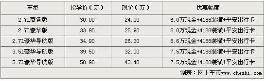 據克萊斯勒經銷商表示,購買克萊斯勒300C除了可以得到300C的價格優惠外,還可以得到4188元的裝潢大禮包和平安出行卡,銷售人員還表示,報價表上的車型展廳有現車都不需要預定。