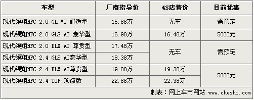 北京現代領翔在去年12月份正式上市,這款車定位于高端市場,推出了2.0和2.4兩個排量共六款車型。自上市以來,領翔在價格上一直沒有出現優惠,根據網上車市價格監測系統顯示,目前購買這款車可現金優惠5000元,具體車型以及價格如下: