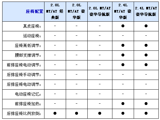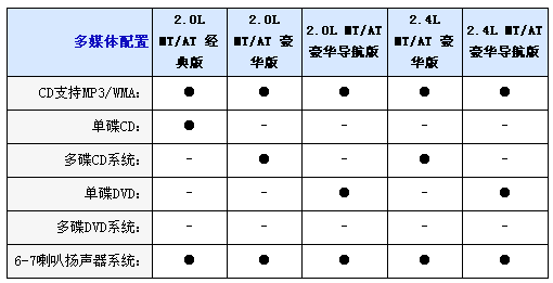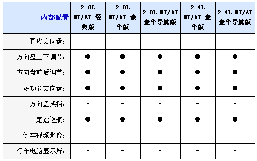 內飾方面2.0L均配備織物座椅,而2.4L車型則采用真皮坐椅并且配備電加熱座椅,并且2.0L配備6向手動調節駕駛座椅,而2.4L配備8向電動調節并且代腰部支撐的駕駛座椅,不過副駕駛全車系只標配4向手動調節座椅,另外入門級車型只配備CD播放器,2.0L和2.4L豪華型采用6CD播放器,而2.0L和2.4L豪華導航型配備DVD播放器和6.5寸寬屏液晶顯示器;包括導航功能,全系標配6喇叭揚聲器、多功能方向盤自動分區空調和后排足部出風口。