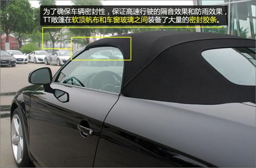 TT 敞篷采用的是軟頂,而并未隨大趨勢使用電折硬頂,軟篷的收折及儲存均比硬頂富彈性,優點是無須占用車尾大量空間,篷身可選擇不同顏色,配搭出更多變化的視覺效果。而且,奧迪TT 敞篷采用的多層布制軟篷有優秀的隔音效果,不必擔心高速行駛時會有巨大的風噪。