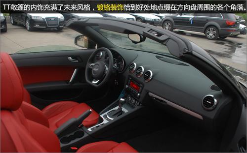 TT的內飾采用了大量的鋁合金飾板,整個車室彌漫著金屬美感。空調出風口、儀表盤和其他按鍵均以圓形為基調,藉以和圓滑的外形相呼應。這些一絲不茍的設計充分顯示出其出類拔萃的名門風范。