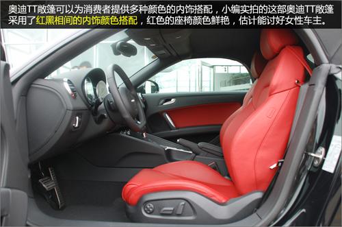 奧迪TT敞篷可以為消費者提供多種顏色的內飾搭配,這次我們到店實拍的這臺TT敞篷采用了紅黑相間的內飾顏色搭配,紅色的座椅顏色鮮艷,估計很能討好女性車主的歡心。
