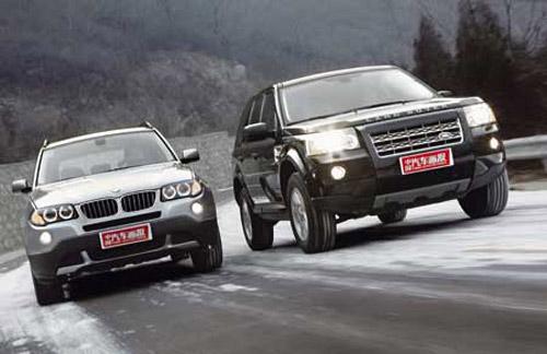 同出名門,且個性鮮明,在車身尺寸和價格上也都相近。因此,神行者2和X3自然而然成為直接競爭對手。有鑒于性能特點,在進入測試內容前,我們先明確一下對它們的稱呼。顯然,“SUV”這個概念寬泛、模糊的名詞缺乏準確性。那就按照廠家各自的定位來歸類它們的屬性吧,路虎神行者2——越野車、寶馬X3——SAV(Sport Activity Vehicle)。