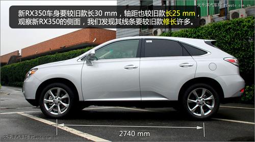 新RX350車身要較舊款長(zhǎng)30 mm,軸距也較舊款長(zhǎng)25 mm。觀察新RX350的側(cè)面,我們發(fā)現(xiàn)其線條要比舊款修長(zhǎng)許多,一改舊款車型給人的臃腫之感。