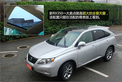 從高處俯瞰新RX350,長(zhǎng)890 mm,寬800 mm的全景式天窗映入眼簾。這樣的設(shè)計(jì)可以讓后排乘客也可充分享受到陽光的滋潤(rùn)。值得一提的是,該項(xiàng)配置僅可在售價(jià)達(dá)85.2萬元的RX350尊貴版上看到。
