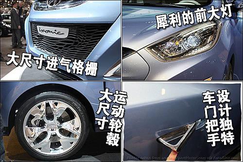 現代ix-onic采用了六邊形的中網設計。這種設計元素最早出現在2006年的Genus概念車上,然后又在2008年的i-mode概念車上得到發展,而在ix-onic則是進行了進一步的進化。在ix-onic的前大燈組中集成了創新設計的LED日間行車燈,當近光燈打開時,日間行車燈光束會在電子系統的控制下下移。