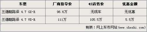 據(jù)經(jīng)銷商銷售人員介紹,豐田-蘭德酷路澤分為4.0L和4.7L兩種排量,由于4.0L車型的尾氣排放是歐III標(biāo)準(zhǔn),沒有達(dá)到北京施行的歐IV標(biāo)準(zhǔn),所以北京限賣,店內(nèi)沒有4.0L車型。4.7L車型分為GX-R版和VX-R版,目前低配的4.7L GX-R車型沒有現(xiàn)車,所以不在此次優(yōu)惠的行列中。高配的VX-R版經(jīng)5.5萬元優(yōu)惠后的售價也降到了105.5萬元。