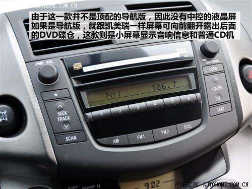 音響面板很簡單,沒有導航版的那么復雜,只是一個小屏幕來顯示音響信息,當然也沒有DVD,只是配備了普通的CD。整個中控面板的材料在視覺上都比較有質感和光澤。弧線造型和三個圓的按鍵組合設計得和諧而美觀。