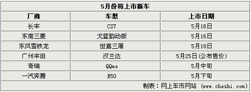 轟轟烈烈的2008上海車展將于今天正式閉幕,而車展上首發的新車、概念車讓人印象深刻,不過在亮相之后,他們最終都會量產上市。在即將到來的五月份就將有6款新車型上市,其中自主品牌繼車展后再唱主角,有3款新車型上市,分別為長豐CS7、奇瑞QQme及奔騰B50。