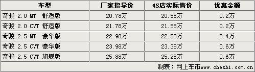 東風日產奇駿自去年11月上市以來一直備受消費者關注。國產后的奇駿填補了東風日產在SUV領域的空白,為那些對越野性有更多需求的城市SUV消費者提供了更多的選擇機會。根據網上車市價格監測系統顯示,奇駿現車供應仍然比較緊張,但較前一陣有所緩解,全系車型均出現了價格浮動。2.5頂配和豪華自動檔車型的優惠幅度均已達到了6000元。