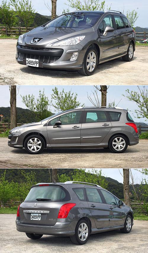 車側部分,308 SW延續了前身307 SW流暢的線條設計,增加了72 mm的車長,也讓308 SW展現更強烈的轎旅氣勢,而在308掀背車型上頗受試車組好評的立體車側線條設計,也沿用到308 SW上,具有相當的身形修飾效果,讓車長較掀背車型超過20公分的308 SW在視覺效果上不顯累贅。