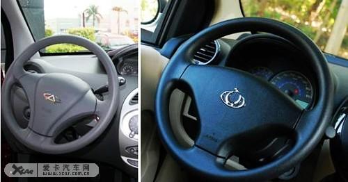 瑞麒M1和熊貓都采用三幅式方向盤設計,瑞麒M1的方向盤中間的LOGO依然使用奇瑞老式車標,方向盤高低可以調節,適合不同身材的駕駛員使用。吉利熊貓則采用了全新的車標,再設計上達到了統一,這一點奇瑞可能在后續車型上會采用全新的車標。