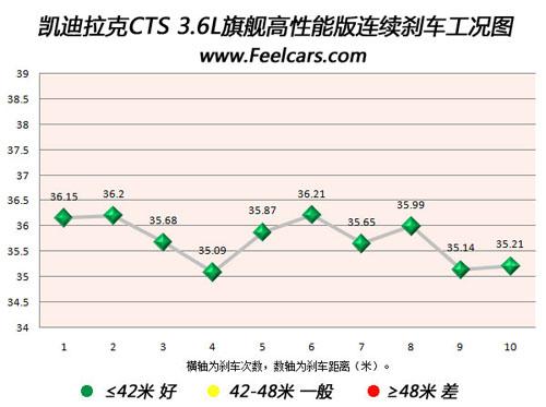 再來看看新CTS的連續(xù)10次剎車成績,最差成績?yōu)?6.21米,與最好成績差距僅為1.1米,且大部分成績均在36米以內(nèi),說明新CTS的剎車系統(tǒng)散熱效果非常好,始終保持在最佳的工作狀態(tài),沒有出現(xiàn)熱衰減現(xiàn)象。