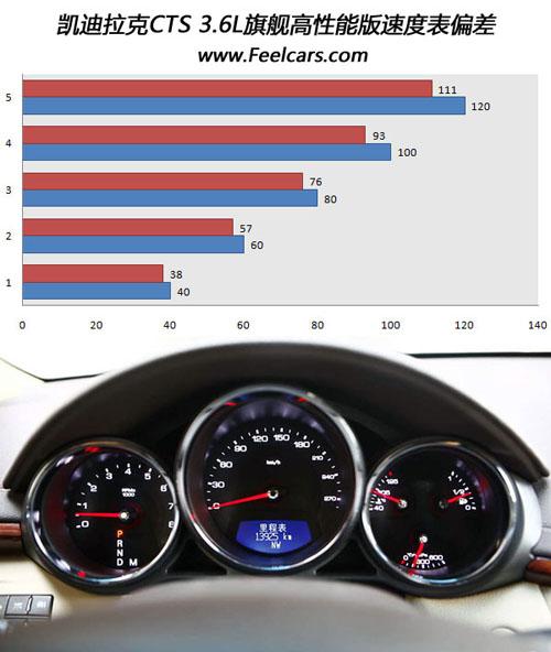 速度表的偏差繼承了凱迪拉克車型的一貫傳統:偏差很大。100km/h的實際速度只有93km/h,而120km/h的實際速度只有111km/h,這在我們測試過的車型中是比較少見的。