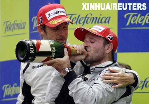 5月10日,布朗GP車隊(duì)的英國(guó)車手巴頓(左)和隊(duì)友巴里切羅慶祝勝利。當(dāng)日,在F1西班牙大獎(jiǎng)賽中,巴頓奪得冠軍,巴里切羅獲得亞軍。新華社/路透