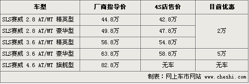 筆者從北京地區凱迪拉克經銷商處了解到,目前SLS賽威的優惠幅度有一定幅度的下降,其中2.8排量和3.6精英版優惠2萬元,3.6豪華版則優惠5萬元。現車顏色主要是黑色款,其他還需要預訂,但訂期時間較長。