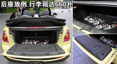 新Mini敞篷擁有較大的行李廂開口,后座椅靠背可單獨折疊和鎖定,擱板可按需要轉動角度,有兩個固定位置可選。行李廂容量在車頂打開時增加到125升,車頂關閉時達到170升,后座靠背折放時達到660升。