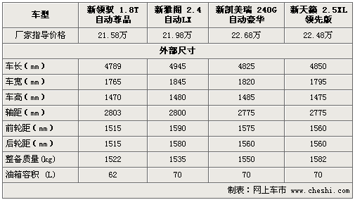 新領馭全系7款車型已于上月底正式上市,售價為16.98-30.38萬元。除前臉和尾部的全新設計外,老款1.8T引擎經過重新調教最大功率達120Kw。而在此中級車細分市場中,新雅閣、新凱美瑞和新天籟均占據著一定的市場份額。下面通過對四款價格相近車型進行詳實解析,以便為您的購車提供一定的參考。