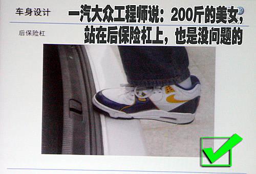 一汽大眾產品部工程師這樣說:“即便一個200斤美女站在我們產品的的后保險杠上,那也是沒有問題的”。雖然我們身邊很少有人去嘗試站在保險杠上,但是這樣的設計都源自大眾的嚴謹態度,在很多時候您的愛車完全可以當作一架小梯子去使用。
