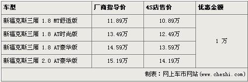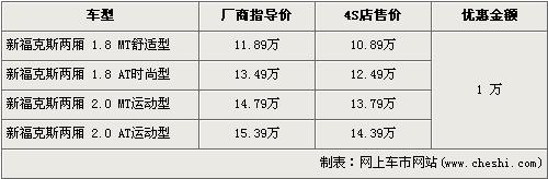 據長安福特經銷商處銷售人員介紹,兩廂新款福克斯全系優惠1萬元。兩廂新款福克斯分為1.8L和2.0L兩種排量,入門級車型的1.8L手動舒適版經優惠后,售價為10.89萬元。高配的2.0L自動運動版售價降到了14.39萬元。