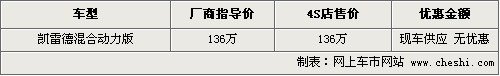 筆者從凱迪拉克北京地區(qū)經(jīng)銷商處了解到,目前凱雷德混合動力版車型已經(jīng)到店,現(xiàn)車主要為黑色。據(jù)銷售人員介紹,混合動力版車型只有白色和黑色兩款車,現(xiàn)在白色款還需要預訂,售價為136萬,現(xiàn)車暫無優(yōu)惠。