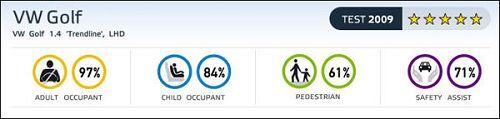 綜合來看,高爾夫6代獲歐洲碰撞測試實驗室5星評價。對成員保護得分率97%,對兒童保護得分率84%,對行人保護得分率61%,安全輔助裝備得分率71%。