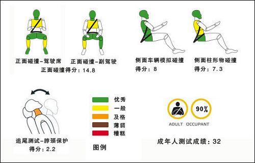 昊銳在正面碰撞中對駕駛員與乘客的胸部保護一般,頭部和盆骨保護最好,駕駛員小腿可能受踏板變形有所傷害。在側面模擬車體碰撞試驗中,昊銳對駕駛員保護良好獲得滿分,但柱體碰撞中對胸部保護不過。對于頸部保護試驗,昊銳只獲得了邊緣成績,對于頭枕的設計有改良空間。最終對成人保護得分率為90%