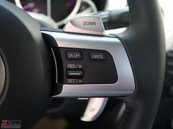 三輻真皮方向盤融合了7個多功能控制按鈕,方便Driver對不同功能進行調節。當然,撥片換擋這一運動車的標志性配置同樣出現在方向盤后面,左右兩側各一組,兩手同為“按減撥增”的設計方便適應不同的駕駛習慣。
