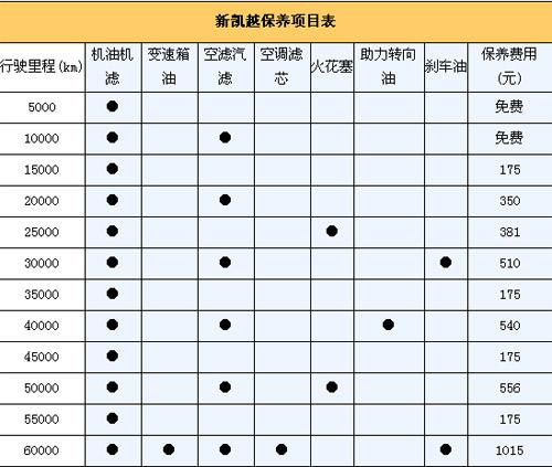 新凱越每次的保養間隔為5000km,首保免費。保修政策為2年/6萬公里保修(以先到為準)。為了方便計算,我們以一年行駛2萬km為標準,那么新凱越一年要做四次保養。由下表可知其一年保養費用1400元。