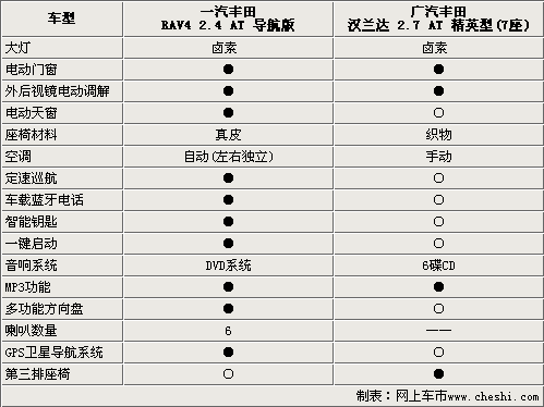 一汽豐田RAV4 2.4自動導航版和廣汽豐田漢蘭達2.7精英型7座的舒適配置相差比較懸殊。RAV4 2.4自動導航版屬于RAV4車系中的頂配車型,舒適配置可謂是應有盡有,電動天窗、真皮座椅、自動空調、定速巡航、多功能方向盤、DVD影音系統等設備都成為了標準配置。而漢蘭達2.7精英型7座屬于該車系中的低配車型,在舒適配置方面盡顯于基本使用。但在空間利用上漢蘭達還是比較具有優勢的,首先漢蘭達最多可以承載7名乘客,而且室內空間可以靈活多變,放倒比例達到了4:2:4,可以更加有效的方便乘客置放大件物品。