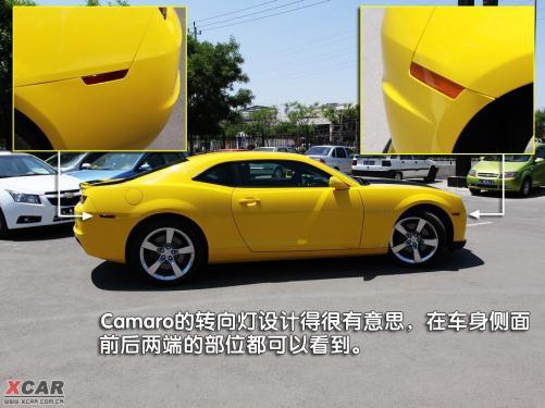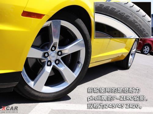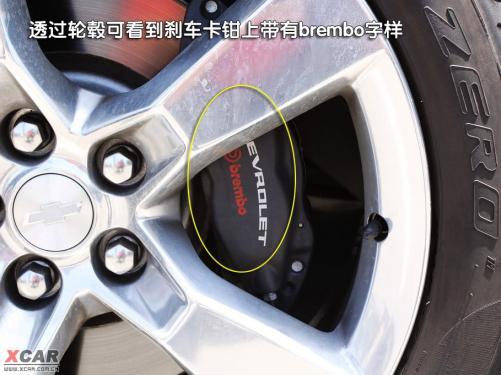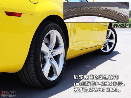 雪佛蘭Camaro的轉向燈設計得很有意思,在車身側面前后兩端的部位都可以看到,這一風格有些保時捷的味道。而在車身的側面不僅能看到Camaro的字樣,在前輪后邊的位置上,還可以看到通用GM的logo,起到了非常不錯的裝飾作用。五輻鋁合金輪轂簡潔、硬朗,很符合這款車的風格,同時4只腳上穿得都是倍耐力pirelli牌的P-ZERO款運動鞋,前邊兩雙鞋的尺碼為245/45 ZR20,后邊兩雙鞋的尺碼為275/40 ZR20。透過輪轂還可看到,前后輪的剎車卡鉗上均帶有brembo字樣。