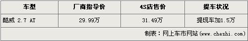 據4S店銷售人員介紹,在售的道奇酷威為2.7L自動檔車型,售價為29.9萬元。近期購買酷威的消費者如要在經銷店提現車,需在廠商指導價29.99萬元的基礎上加價1.5萬元才可提車,加價后的價格增長為31.49萬元。銷售人員還介紹,店內只有一輛酷威銀色現車。