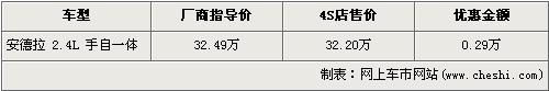 據(jù)4s店銷售人員介紹,目前歐寶安德拉現(xiàn)金優(yōu)惠2900元,在售的2.4L 手自一體車型售價(jià)經(jīng)優(yōu)惠后降為了32.20萬元。本車外觀共有白、乳白、黑、灰、銀、藍(lán)6種顏色,內(nèi)飾有黑、棕兩種顏色,總共12種顏色搭配供消費(fèi)者選擇。銷售人員還介紹,店內(nèi)現(xiàn)車比較有限,以灰色和藍(lán)色為主,其他顏色需預(yù)訂。