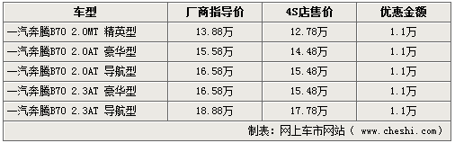 各家銷售人員均表示北京各個展廳內(nèi)09款奔騰B70現(xiàn)車充足,現(xiàn)在購車的消費(fèi)者將最高享受到1.1萬元現(xiàn)金優(yōu)惠。據(jù)了解,此車型銷售較快的型號主要是2.0L的導(dǎo)航版車型,以及2.3L高配的兩款車型。