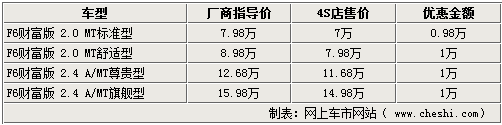 據(jù)銷(xiāo)售人員介紹,目前比亞迪F6財(cái)富版全系可最高優(yōu)惠萬(wàn)元現(xiàn)金。在售車(chē)型涵蓋4款車(chē)型兩個(gè)排量,2.0L的兩款手動(dòng)車(chē)型以及2.4L的兩款自動(dòng)檔車(chē)型。購(gòu)車(chē)同時(shí)還有部分內(nèi)外裝飾或保養(yǎng)優(yōu)惠贈(zèng)送。