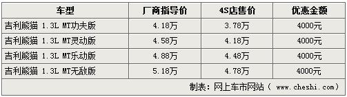據銷售人員介紹,吉利熊貓的各款車型現在已經可滿足消費者需要。目前主推4.58萬的靈動版和4.88萬的樂動版,兩款車型是銷量最佳的車型,并有試駕車提供給客戶體驗。另外,銷售人員表示,目前購買吉利熊貓系列車型4S最多可以優惠4000元現金。