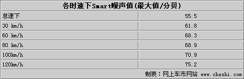 也許有人會擔(dān)心smart這么小的車隔音和密封性是否有問題,為此我們在北京北四環(huán)路中關(guān)村附近進(jìn)行了測試,在車外我們測得了最高77分貝的環(huán)境噪聲;而當(dāng)我們進(jìn)入到車內(nèi)噪聲指數(shù)立即下降了22分貝之多,55分貝的水平幾乎達(dá)到了辦公室的安靜程度。