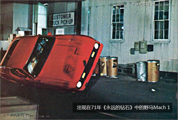 個人感覺相比64、65年的敞篷野馬,71年的《永遠的鉆石》中福特野馬Mach 1讓人印象更加深刻。在逃脫以后,邦德在拉斯維加斯上了Tiffany Case的這輛車;他用它來逃脫拉斯維加斯警察的追捕(除了拉斯維加斯警察局的車為1970年產福特之外,其他警車,包括安全部隊的車都是1971年產福特Custom 500。)此外,Mach 1甚至還出現在了1973年的蝙蝠俠漫畫中。