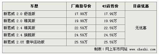 據4S店銷售人員介紹:目前新君威2.0升及2.4升車型有少量現車,一改之前只有預定才能提現車的緊張局面。但現車不是非常充足,且顏色也不齊全,所以有意向的朋友抓緊時間購買。目前新君威無任何優惠,也不附贈任何裝飾。期待已久的2.0T新君威將在7月中旬到店,喜歡的消費者可以與經銷商聯系,還能夠享受一次長時間試駕活動,讓每個人都能夠身臨其境的感受這款車的魅力。