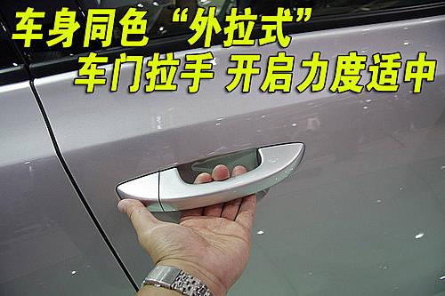 車門內側拉手采用鍍鉻設計,金屬感比較強烈。雖然拉手周圍由塑料制成,但是拉手周圍的做工都很精細。