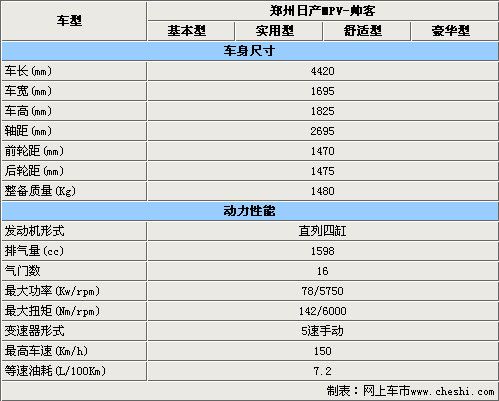 鄭州日產即將投產的帥客分為四款車型,這四款車型的長寬高都分別達到4420/1695/1825毫米,軸距也達到了2695毫米,這些數據確保了其寬敞的內部空間。1470毫米和1475毫米的前后輪距保障了帥客的操控性能。動力方面帥客搭載了1.6升直列四缸發動和5速手動變速箱,最高時速可以達到150公里/小時。