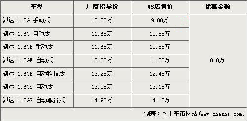 據(jù)東風(fēng)日產(chǎn)4s店銷售人員介紹,目前東風(fēng)日產(chǎn)騏達全系優(yōu)惠9000元。經(jīng)優(yōu)惠后,入門級的1.6G手動版售價下降到了9.88萬元,而全系最高配的1.6 GS自動尊貴版售價也降到了14.18萬元。銷售人員還介紹,目前店內(nèi)沒有騏達現(xiàn)車,欲購買者需交2000元訂金約等1個月時間。
