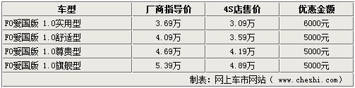 比亞迪F0作為該品牌旗下的首款微型轎車,售價(jià)3.69-5.39萬元。在比亞迪F0愛國版上市初期,這款車就出現(xiàn)了最高1500元的優(yōu)惠幅度,隨著時(shí)間的推移,優(yōu)惠金額也在增加。網(wǎng)上車市網(wǎng)站由經(jīng)銷商處了解到,比亞迪F0在近日又出現(xiàn)了更多的優(yōu)惠幅度,最低配的車型最高可優(yōu)惠達(dá)6000元。