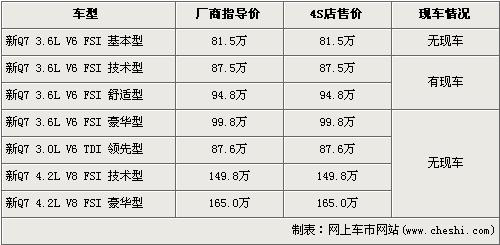 據北京奧迪4S店銷售人員介紹,新款的奧迪Q7有三個排量共7款車型,售價區間為81.5萬元-165萬元。目前店內已經到第一批先期預訂的奧迪新Q7現車,車型為3.6L技術型和3.6L舒適型,F在欲購買新Q7的消費者需交1萬元訂金,下個月中旬方可提車。