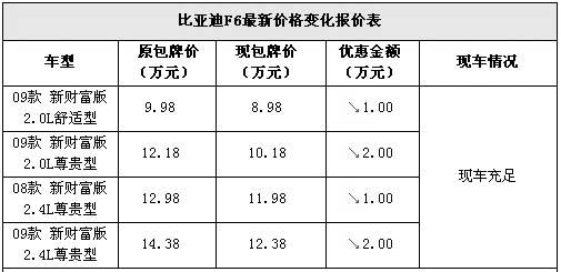 近日,編輯從深圳粵迪比亞迪4S店了解到,目前比亞迪F6現車比較充足,并且有1-2萬元的現金優(yōu)惠,該優(yōu)惠是在包牌價的基礎上實行,感興趣的朋友請致電咨詢。具體價格請見下表: