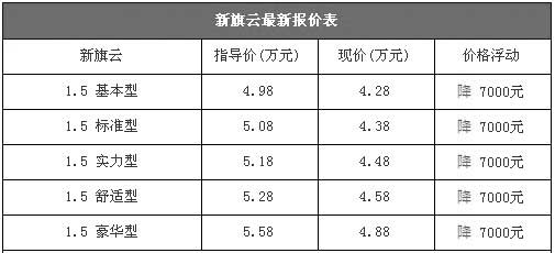 我們認為,目前國內4-5萬元區間內,新旗云的性價比非常不錯,非常適合家用。北京地區新旗云的價格已經穩定了2個月時間,根據我們的推測以及競爭對手的價格走勢來看,新旗云的價格已經觸底,再次降價的可能性非常小,因此近期準備購買5萬元以內,對車內空間有要求的朋友可以考慮入手新旗云。