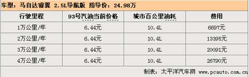 睿翼是我們對比的中高級車中油耗最低的一款車,城市百公里油耗僅為10.4L,對于一款2.5L排量的車型來說可謂十分出眾,而且馬自達廠商聲稱睿翼是可以使用93號汽油的而且不會對發動機造成影響,93號汽油比97號油每升便宜了0.41元!所以總體來說,假如車主每年行駛3萬公里的話,一年下來對比燃油費用最高的銳志可以節省近5000元。